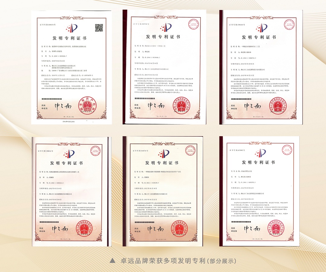 截止目前,卓远品牌已获得了150+项专利,并正开展远红外线和诱生负氧离子的岩板及其制备方法、具有降解甲醛功能的岩板及其制备方法、具有氨净化功能的岩板材料、具有氨净化功能的岩板材料、具有苯吸收功能的岩板材料等健康功能产品的创新性重点性布局。